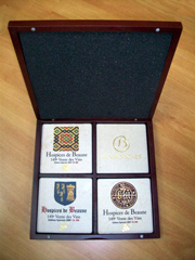 All of our coasters, bottle coasters and trivets are fabricated using the famous "Rose de Bourgogne" marble. We make each one by hand in our little shop in Beaune. Come on in, look around, and find some treasures!