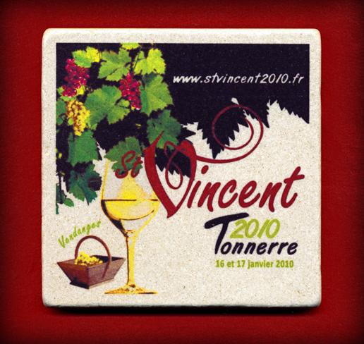 We are honored to have been selected as an Official Partner for the 2010 St. Vincent Tonnere. An exclusive offering from La Boutique de Bacchus to you, the 6 Official posters (vendanges (shown), terroir, fleur, vinification, degustation and taille) of the St. Vincent on coasters, trivets, key rings - you choose. |  |